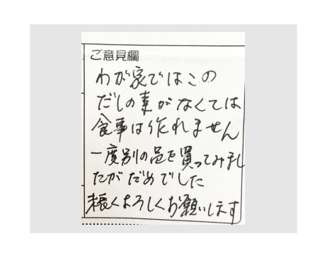 取り扱い店舗が少ない中、弊社おだしを見つけ、そしてお使い下さりありがとうございます。お母さんの毎日のお味噌汁、きっと子供さんの記憶の中にもずっと残り続けるでしょうね。これからも宜しくお願い致します。 -