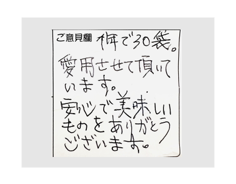 いつもご利用下さりありがとうございます。家族団らんの美味しい食事は心と体を健康にしてくれますね。ご高齢との事ですが、これからも健康寿命を延ばしいつまでも元気にお過ごし下さいませ。今後とも宜しくお願い致します。 -