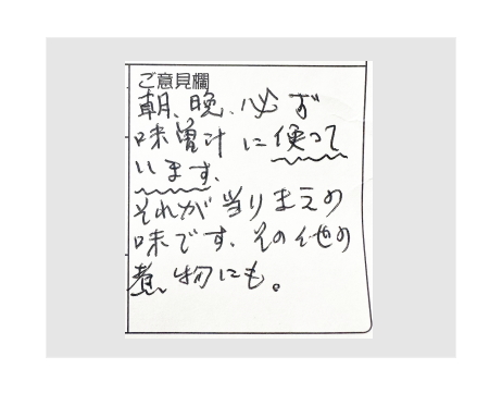 お客様からの応援メッセージ、とても励みになります。ありがとうございます。娘様にとってきっとお母様の一杯のお味噌汁がホッとできる瞬間なんですね。 -